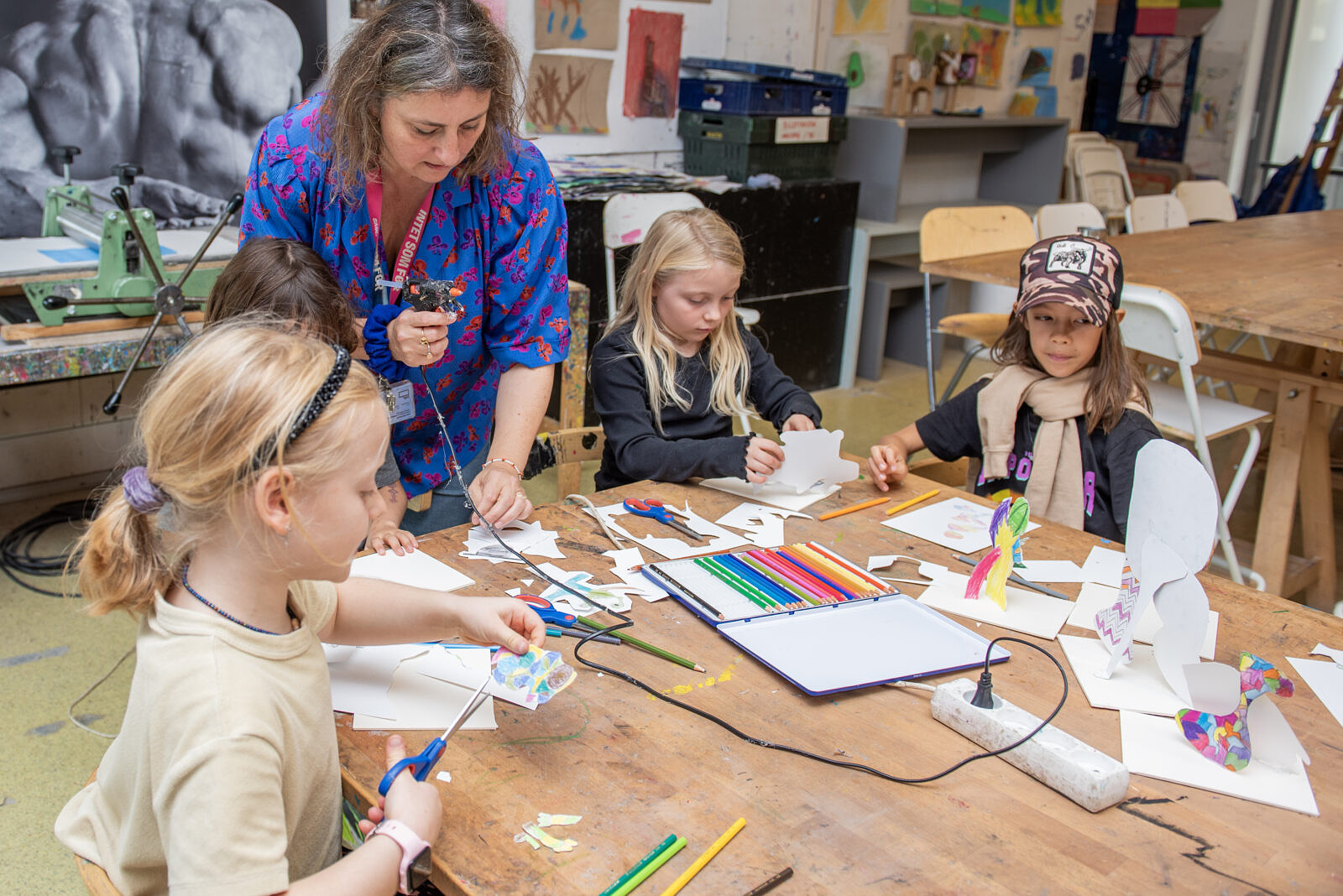 Vi øver os i at tegne efter skulpturer rundt omkring på museet. I værkstedet tegner vi frit fra fantasien.